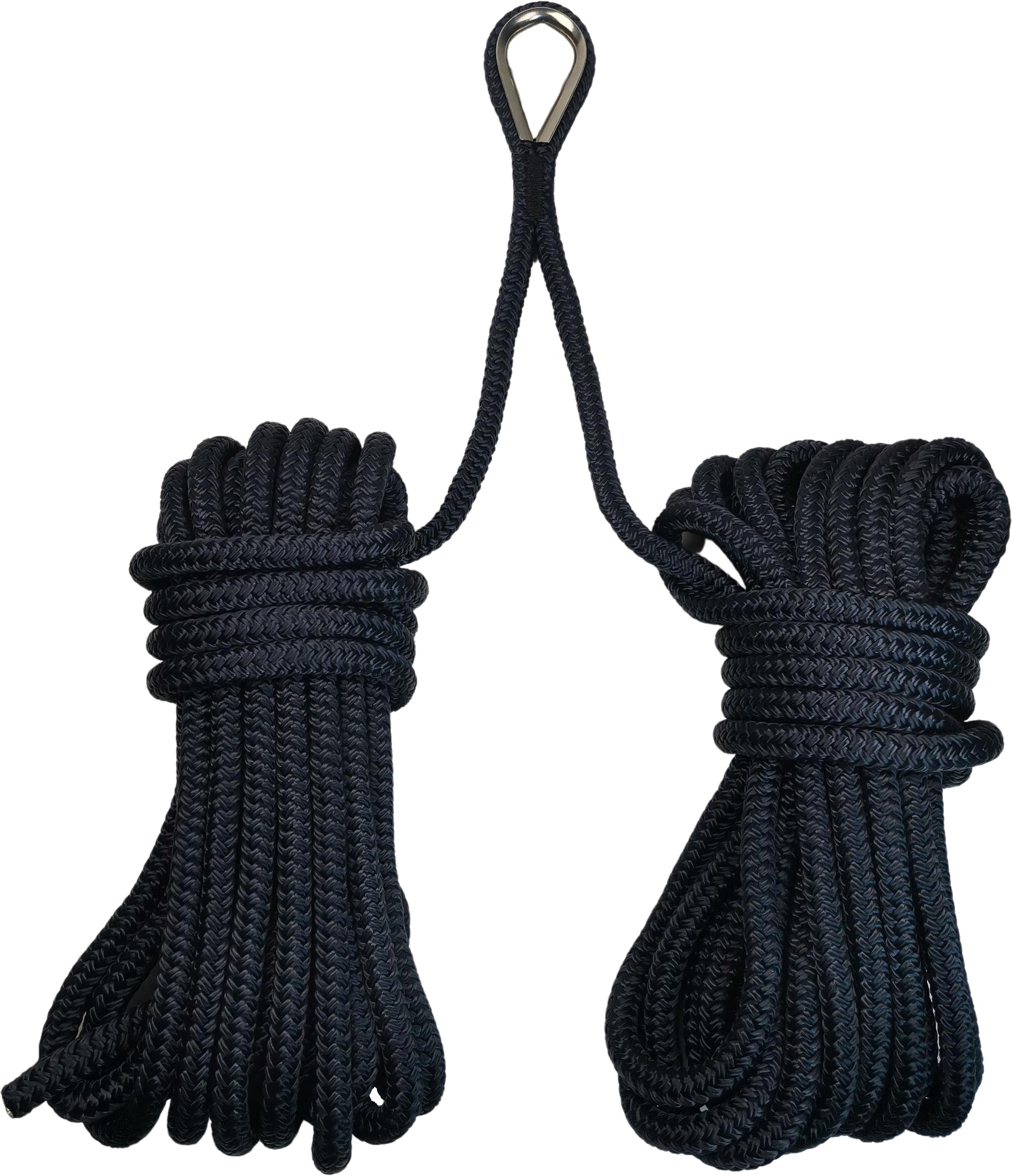 Praktisk V-fortøyning med kause i syrefast stål. Tauet er laget av flettet polyester. Ut fra kausen går det 2 x 10 meter tau.