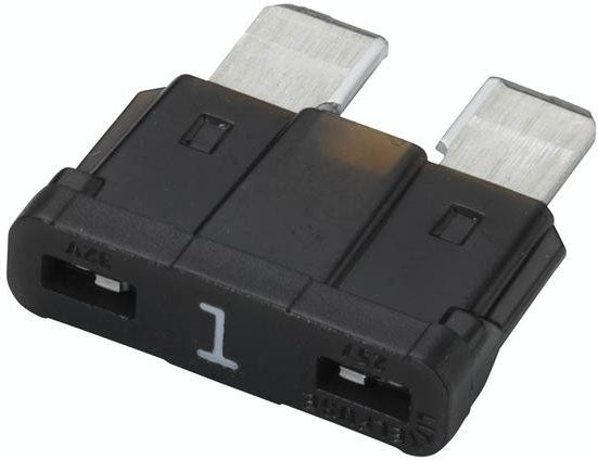 Klassisk flatsikring på 1 ampere. Sikringen har polyamidkabinett, og fortinnet overflate på kontaktpunktene.