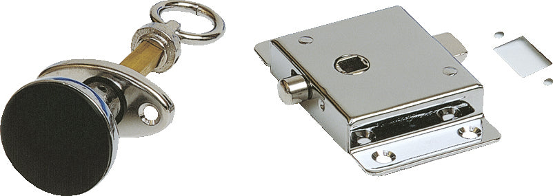 Utenpåliggende WC-lås. Kan låses fra innsiden. Låsen består av låsekasse, ett ovalt skilt og vrider (Taiwan type).