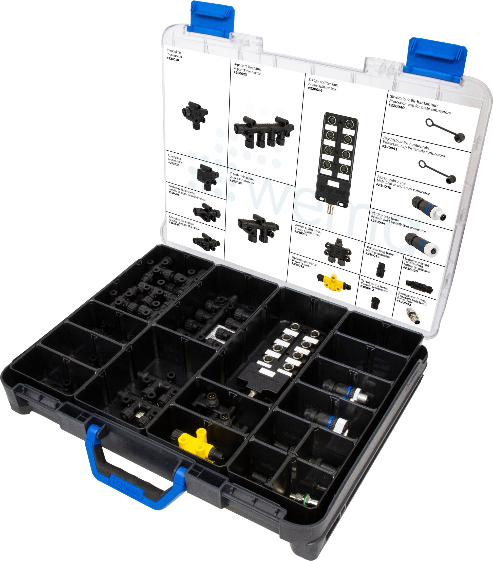 Wemas smarte NMEA2000 koffert gir deg et komplett sortiment med de vanligste NMEA2000 kontakter og koblinger. Den gir deg store muligheter til å koble et ryddig NMEA2000 nettverk. Kofferten er ryddig, og gir deg full oversikt over innholdet. Skulle du ha behov for å supplere med annet utstyr, kan du flytte veggene og omrokkere. Kofferten er kompatibel med Sortimo WorkMo.
